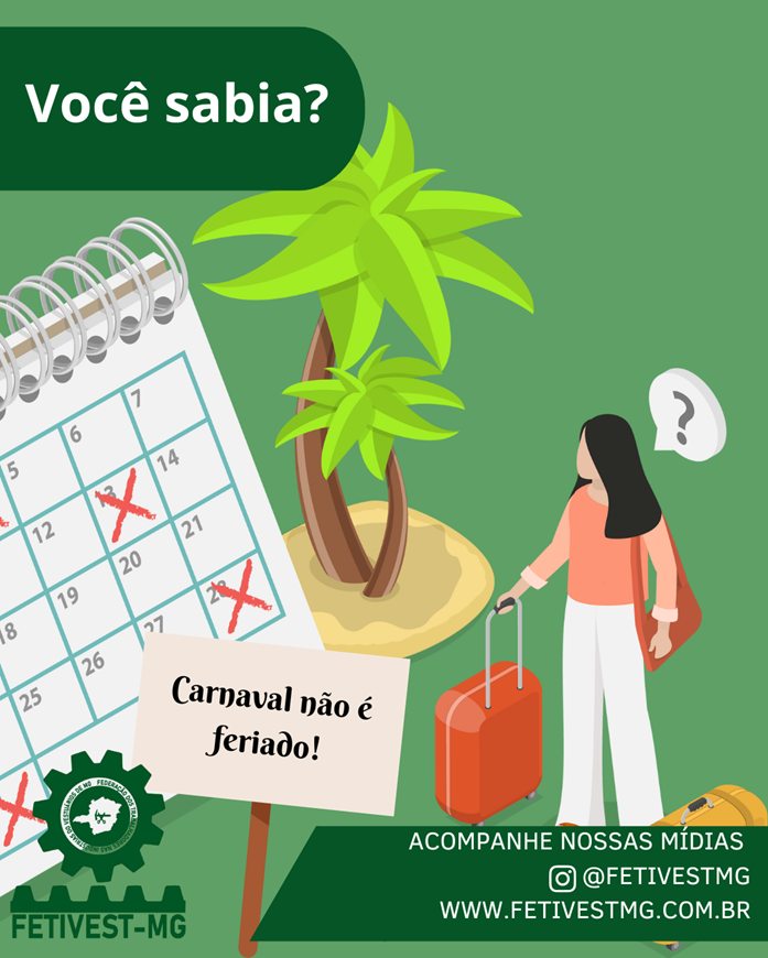 Atenção trabalhadores! Carnaval não é feriado para indústria, então fiquem atentos. Na segunda feira de carnaval é considerado feriado para a nossa categoria, pois foi uma conquista do sindicato para os trabalhadores. Os demais dias não são feriados.
